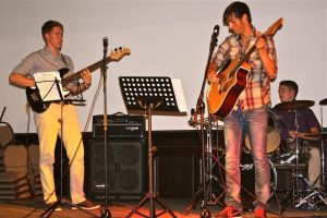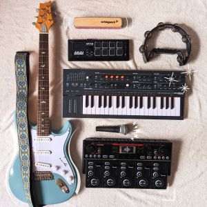 Darum habe ich mir in diesem Jahr überlegt, meine Einzel-Performance auf ein neues Level anzuheben und habe mir eine sogenannte Loop-Station besorgt. Diese kann verschiedene eingespielte Klänge beliebig oft wiederholen – also „loopen“, sodass mehrere Instrumente zu hören sind. Damit versuche ich einen Bandkontext zu simulieren. Ich habe Hilfsmittel für Rhythmen wie einen kleinen Sample-Player und verschiedene Percussion-Instrumente, einen Synthesizer für tiefe Bässe und große flächige Sounds und meine Gitarre für die Gesangsbegleitung und melodische Soli. Sollte ich das Bedürfnis nach einem mehrstimmigen Gesang haben, ist es außerdem möglich, die Stimme in verschiedenen Tonhöhen einzusingen und so einen kleineren Chor nachzuahmen.