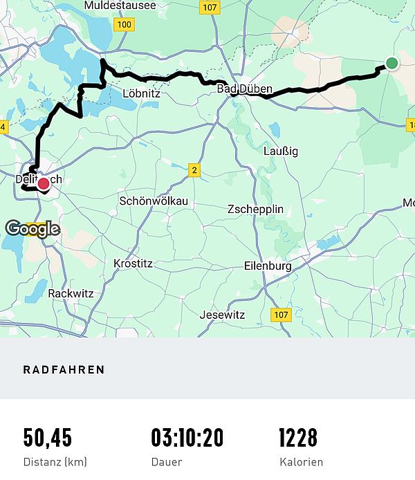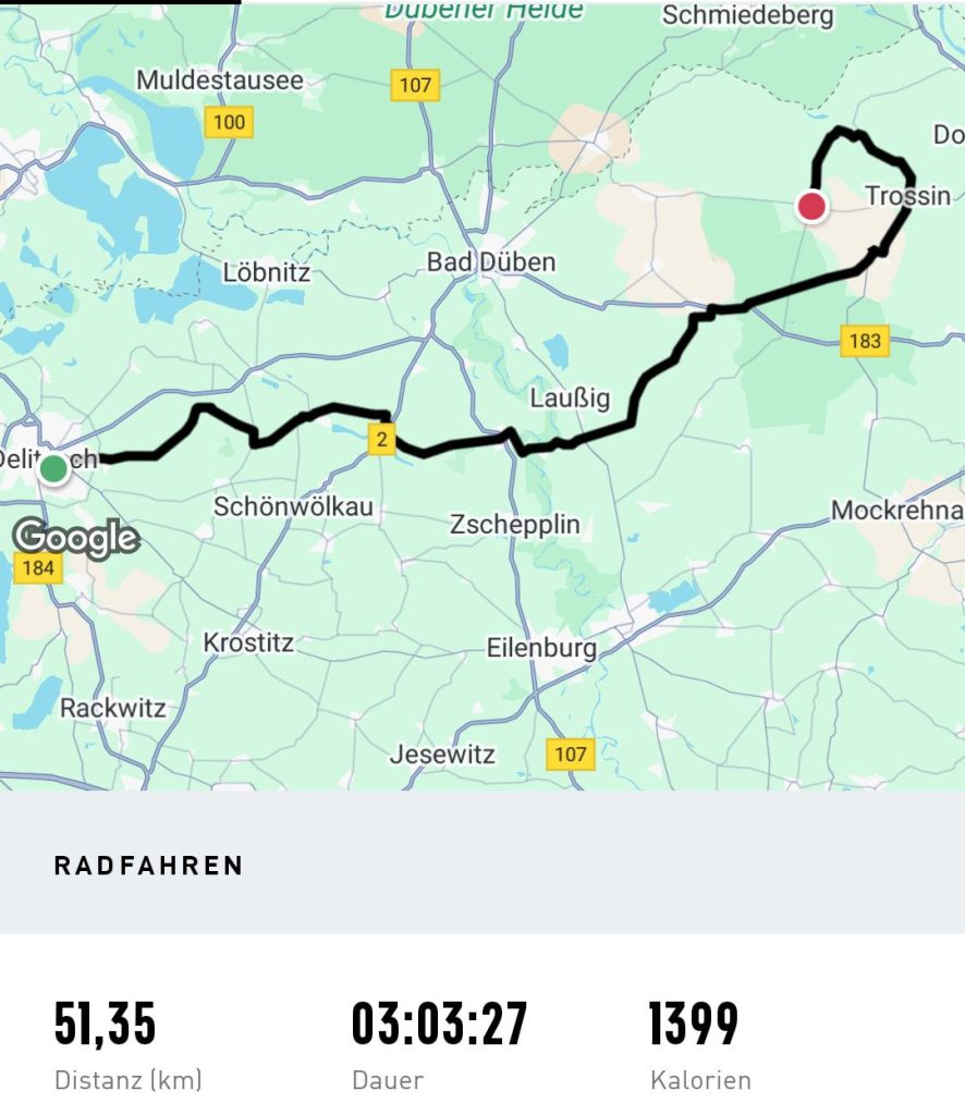 Aber zurück zur Challenge – in Roitzsch hatten wir ca. 40km auf der Uhr und bei direktem Weg zurück sind die 100 km nicht zu schaffen. Also radelten wir erst mal zu Tante Jana nach Dahlenberg, wo wir eine kleine Erfrischung in Form von Eis serviert bekamen. Unser nächster Halt war Falkenberg bei Oma Gisela. Hier wurden wir mit ausreichend Kalorien für die Rückfahrt versorgt. Unglücklicherweise fiel mir mein Handy runter und meine Tracking App wurde dabei gestoppt.